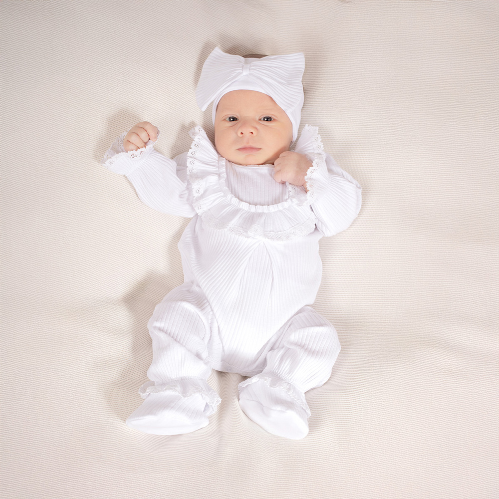 Un clovn și pantofi pentru fete, din bumbac. Are mâneci din dantelă și volan.  Datorita faptului ca este fabricat din bumbac certificat, copilul tau se va simti confortabil in el. Romperă prinsă cu capse fără nichel.