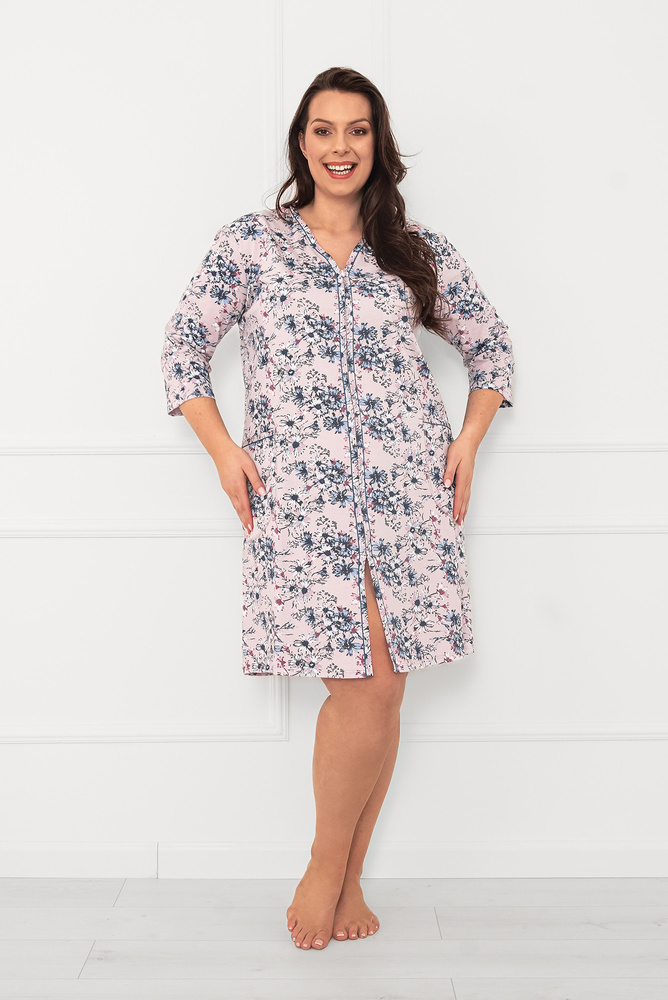 Acest halat de casă pentru femei este alegerea perfectă pentru cei care apreciază confortul și stilul în casă. Cu fermoar și decolteu în V finisat cu bordură contrastantă, acesta combină funcționalitatea cu un design subtil. Mâneca 3/4 asigură confort în toate anotimpurile, iar lungimea până la genunchi garantează libertate deplină de mișcare. Există buzunare practice pe partea din față care sporesc funcționalitatea acestuia. Fabricat din țesătură tricotată din bumbac cu un model floral în nuanțe pastelate. Disponibil în mărimi de la M la XXXL.