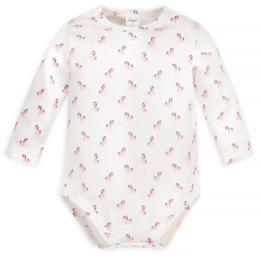 Body pentru bebelusi cu maneca lunga este confectionat 100% din bumbac ecru delicat decorat cu imprimeu de cai de fete. Îmbrăcămintea este foarte ușor de îmbrăcat, mulțumită închiderii de la nivelul picioarelor și de la gât cu capse sigure, fără nichel. Body-ul va crea un set frumos cu costume de dormit și o pălărie din aceeași colecție. Acesta este un element esențial al laietei pentru un nou-născut. Este produs în Polonia.