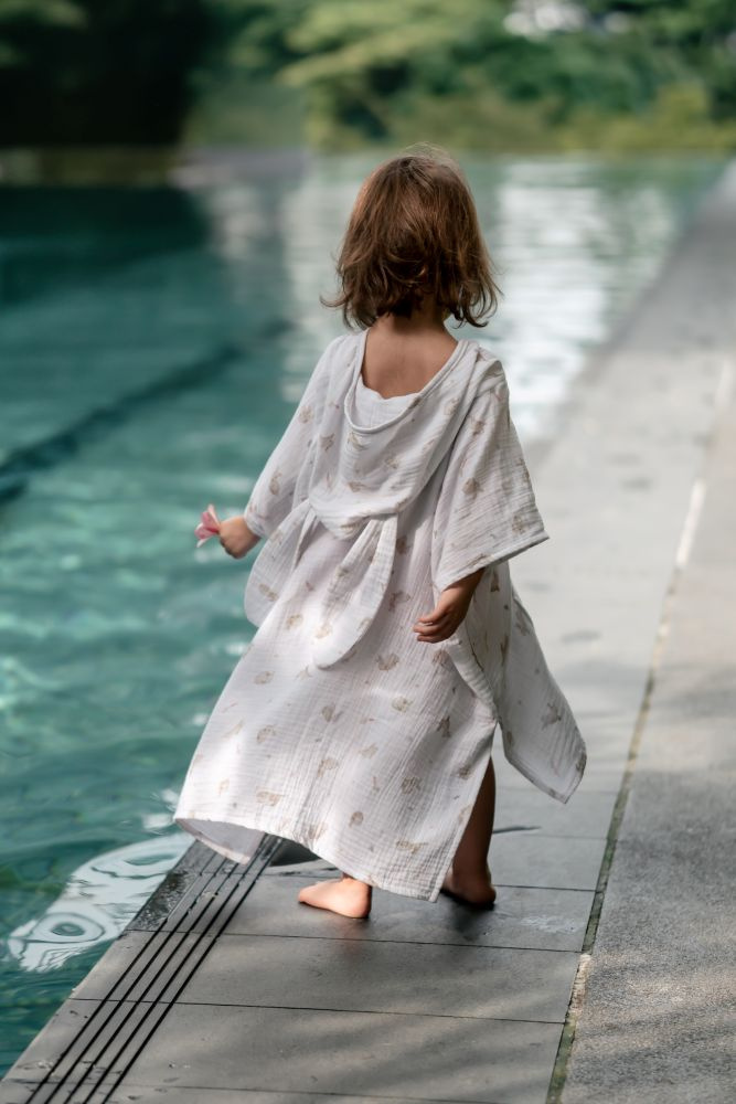 - Poncho de înot moale și ușor de muselină cu glugă pentru copii. Fabricat din bumbac muselină 100% - respirabil, cu uscare rapidă și prietenos cu pielea sensibilă. Perfect după baie, pentru piscină sau plajă. Confort și protecție într-una