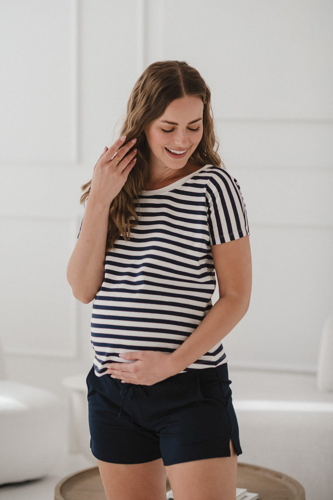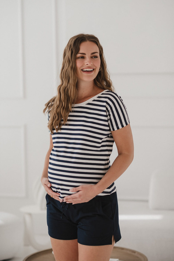 Bluză reversabilă de maternitate și alăptare Two Ways | Mânecă scurtă, confortabilă Milk&Love bleumarin și dungi albe