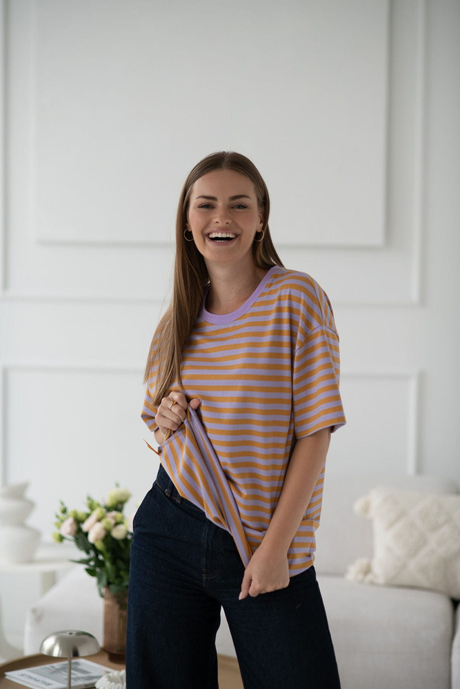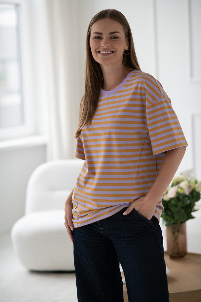 Tricou Mamahood Milk&Love pentru sarcina și alăptare, dungi miere și liliac – confortabil și elegant