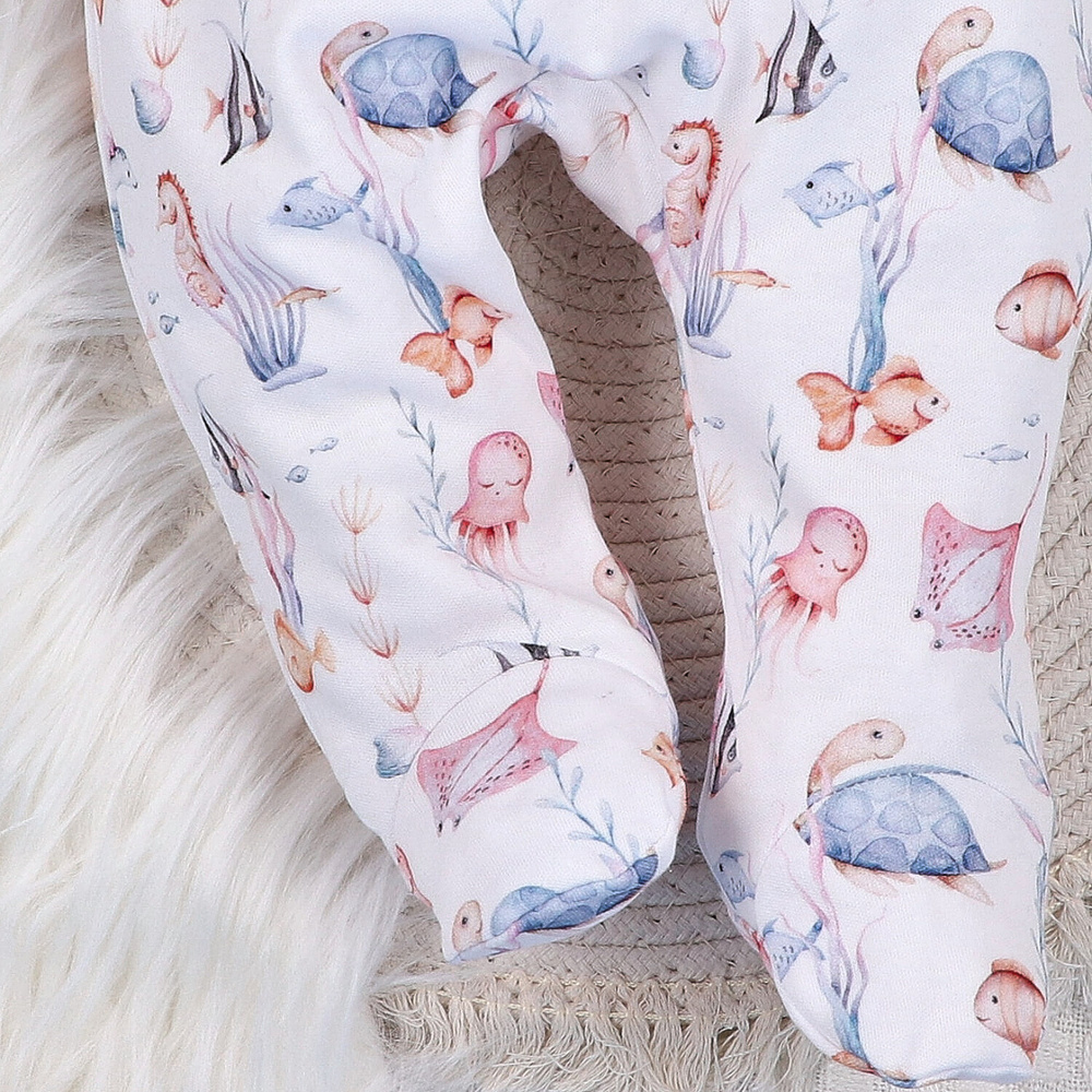 Costumele de dormit pentru bebeluși Underwater World de la Nini sunt soluția perfectă de zi cu zi pentru bebelușul tău. Confectionate din bumbac organic 100%, sunt moi, delicate si aerisite, ceea ce asigura confort si siguranta pielii sensibile a copilului. Cureaua elastică se potrivește bine pe burtă fără a o comprima, iar picioarele încorporate protejează picioarele de frig. Un motiv fermecător al mării conferă costumelor de dormit un caracter unic.