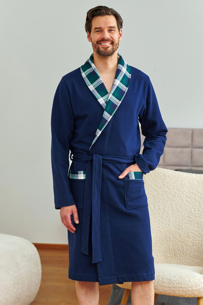 Modelul 7366 este o propunere pentru un bărbat care prețuiește atât confortul, cât și stilul bun. Fabricat din bumbac de înaltă calitate, halatul de baie acoperă corpul cu material moale, natural. Croiala clasica in albastru marin intens este completata de detalii din material tartan - pe guler si buzunare. Cravata din talie asigura o potrivire perfecta, iar buzunarele practice pun in valoare functionalitatea modelului. Perfect atât pentru diminețile reci, cât și pentru serile cu o carte sau un serial TV. Acesta este luxul de acasă în cea mai bună formă.