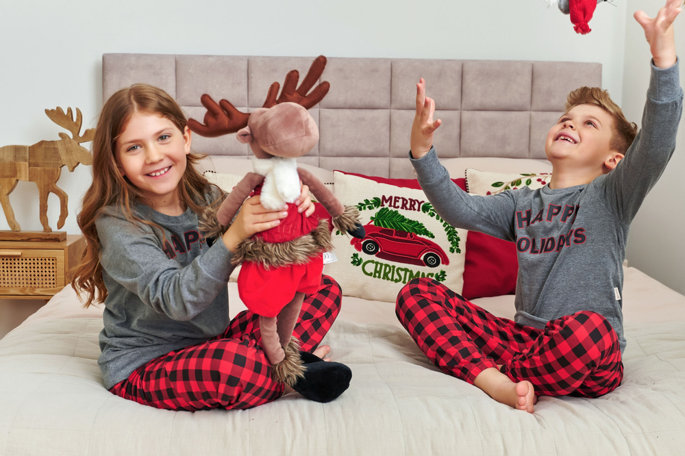 Un top gri cu imprimeu „Sărbători fericite” creează o atmosferă festivă, în timp ce pantalonii în carouri roșii și negre adaugă stil și bucurie. Croiala lejera nu restrictioneaza miscarea, asa ca pijamalele sunt perfecte si pentru a juca acasa.