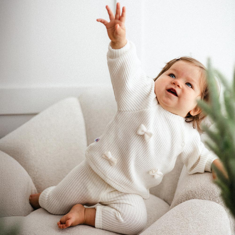 - Pulover pentru bebelusi Eevi in culoare ecru. Cu fundițe drăguțe în față și mâneci cu mansete. Moale, confortabil și perfect pentru zilele mai reci.
