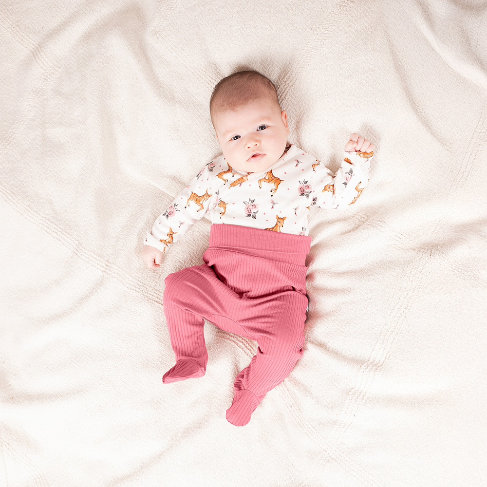 Croiul lejer permite o mișcare ușoară și se potrivește perfect cu un scutec, în timp ce talia lată asigură confort și previne presiunea asupra burticii delicate. Acest pijamale este perfect atât pentru dormit, cât și pentru joacă în timpul zilei.