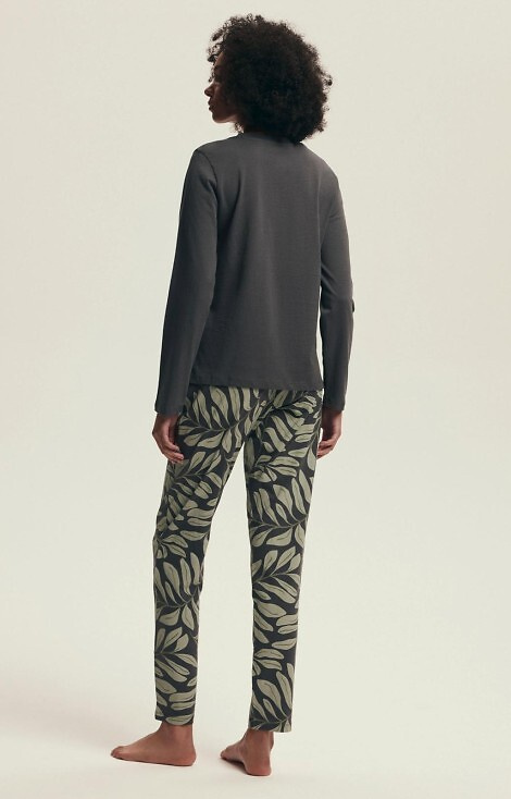 Pijamalele pentru femei Henderson Danna 43685 sunt alegerea perfectă pentru femeile care apreciază confortul și materialele naturale. Setul include un tricou cu mânecă lungă și decolteu rotund, împodobit cu un imprimeu botanic subtil pe față, și pantaloni lungi cu un imprimeu botanic la modă.