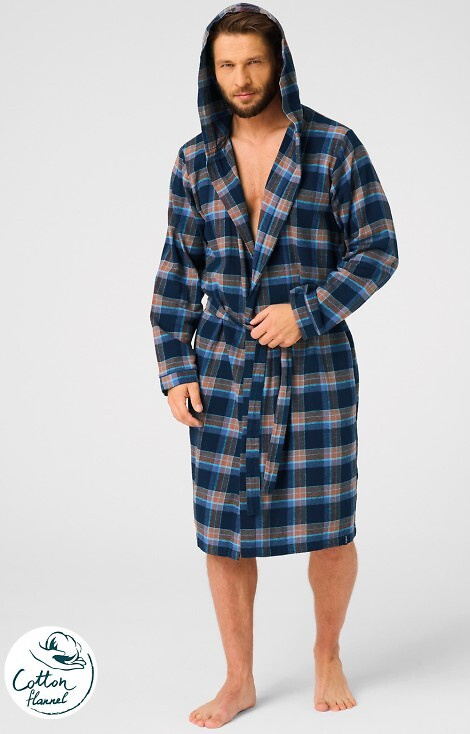 • Halat de baie pentru bărbați Key MGL 431 din tricotaje moi. Model in carouri, buzunare, curea in talie, guler sal.