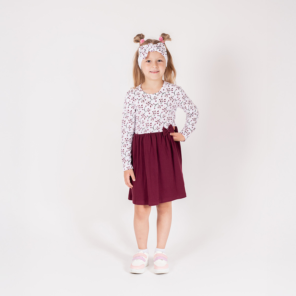 Rochia Nicol Alisa 217166 este o combinație de eleganță și confort. Partea superioară este decorată cu un model subtil de plante, iar partea de jos uniformă, visiniu, conferă întregului un caracter clasic. Arcul din talie adaugă farmec, subliniind stilul fetiței.