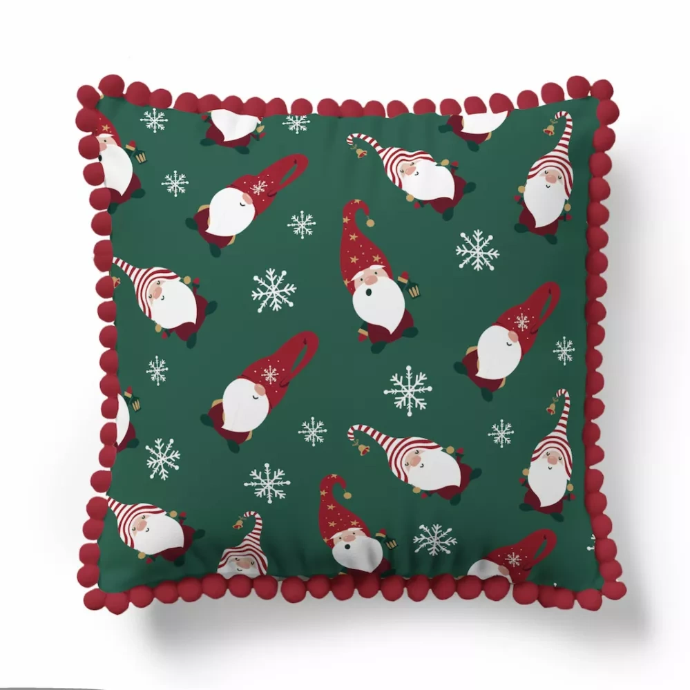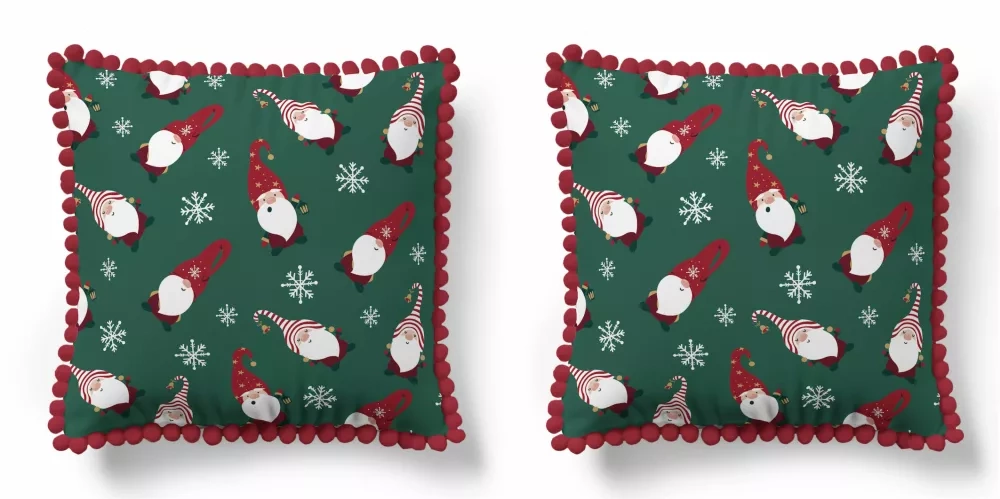 5383 Față de pernă decorativă Detexpol de Crăciun Deco cu pitici și fulgi de zăpadă pe fundal verde - fermoar
