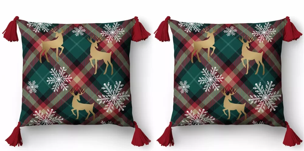 5381 Față de pernă decorativă Detexpol de Crăciun Deco cu reni și fulgi de zăpadă pe un fundal în carouri - fermoar