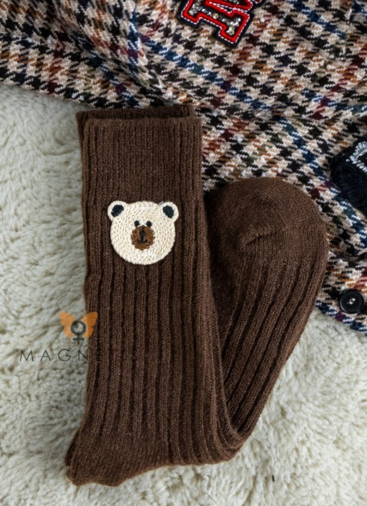 YN5031 Șosete calde pentru femei cu față de ursuleț de pluș Magnetis maro - cu nervuri și broderie