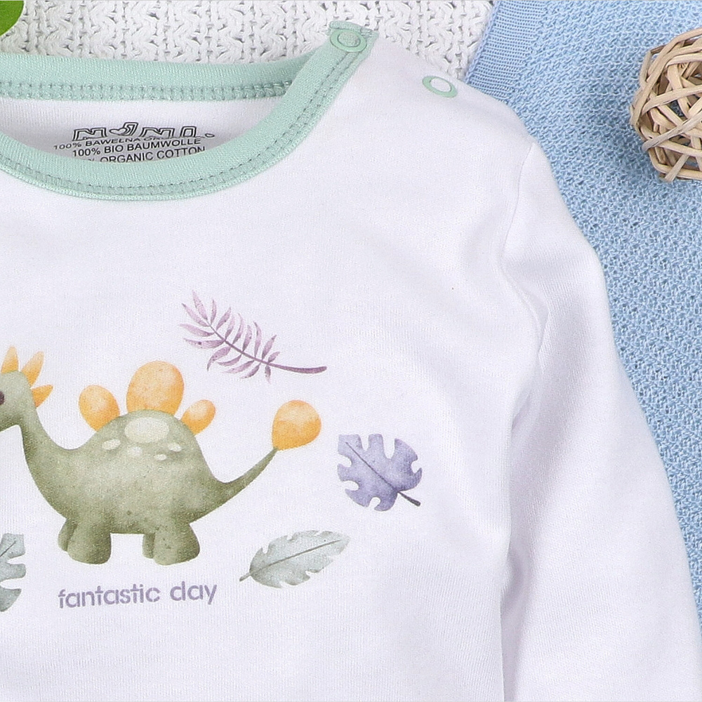 - Body pentru bebeluși Nini Dino Explorer – 100% bumbac organic, mâneci lungi, închidere confortabilă cu capse.