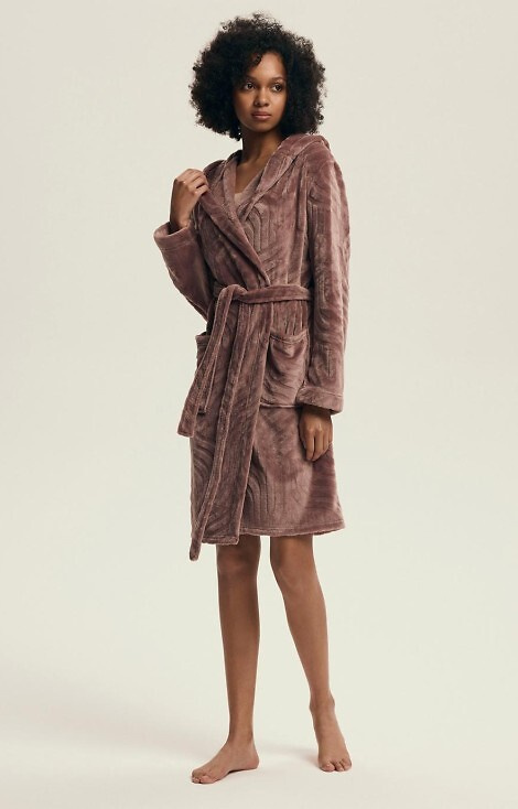 • Elegant și practic, halatul de baie cu glugă pentru femei 43602 Devyn Henderson. Materialul moale și călduros, modelul geometric și buzunarele practice îl fac alegerea perfectă pentru serile răcoroase.