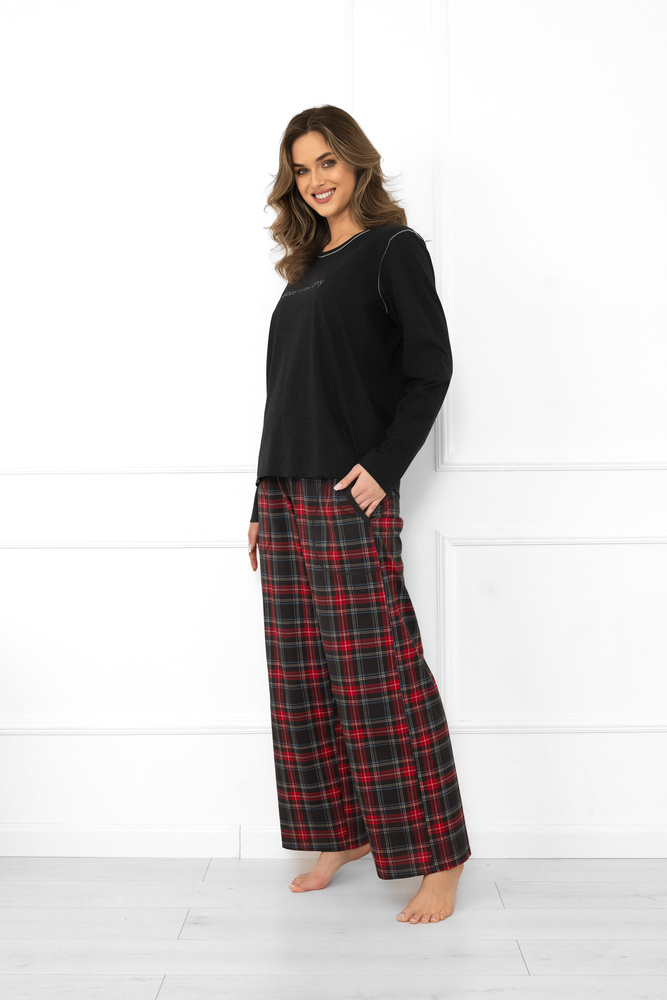 Pijama pentru femei Italian Fashion din bumbac melange închis, cu mânecă lungă și pantaloni, în carouri