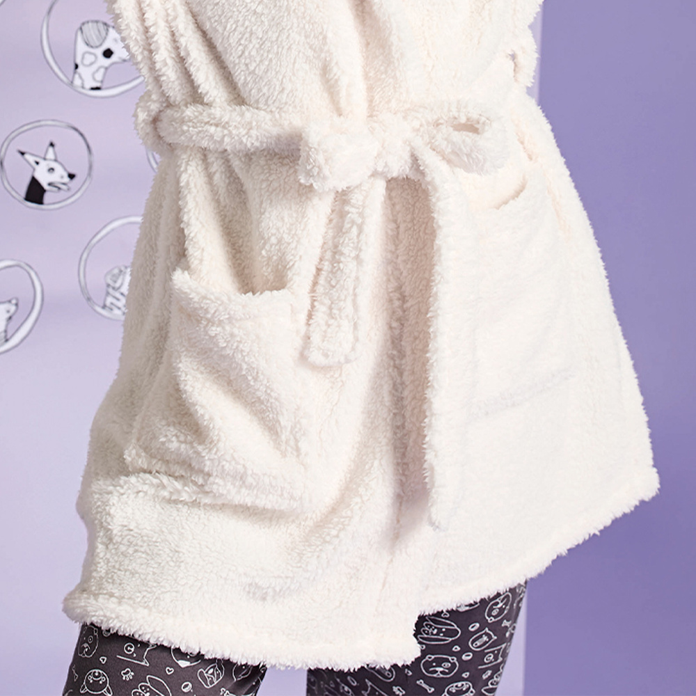 - Halatul de baie IGRID Sorbetto, fermecător și moale, combină căldura, confortul și un aer jucăuș. Fabricat din material sherpa pufos, are o glugă cu urechi și o față de ursuleț de pluș brodată – perfect pentru diminețile răcoroase și serile relaxante.