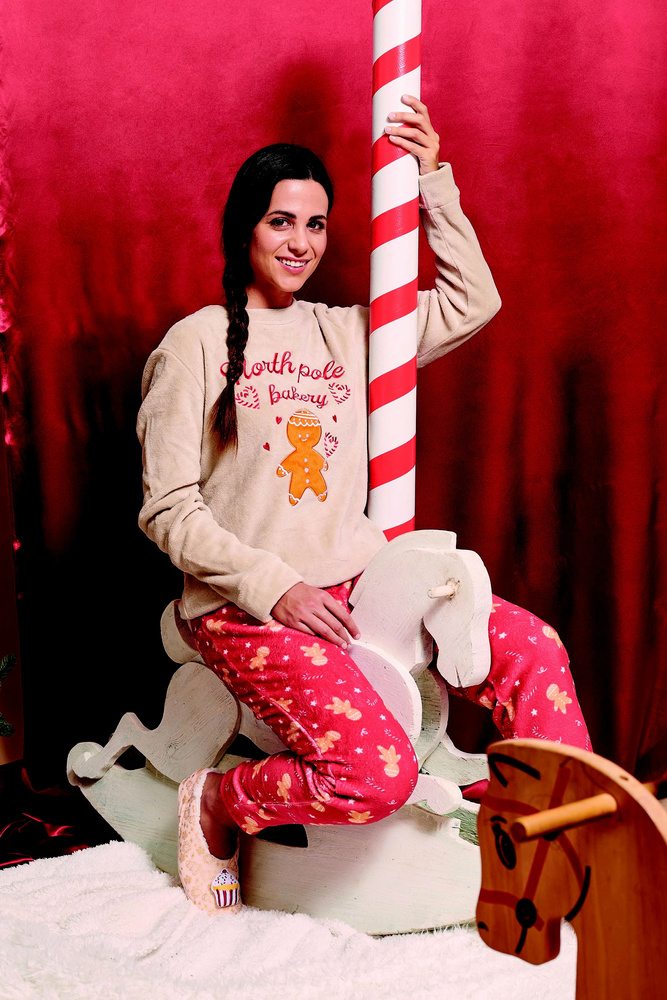 - Pijamalele Meddy Sorbetto, confecționate din fleece moale de culoarea coralului, te vor învălui în stilul sărbătorilor. Hanoracul prezintă un cal balansoar cu sloganul „Ginger Horse”, iar pantalonii prezintă fursecuri de turtă dulce și acadele.