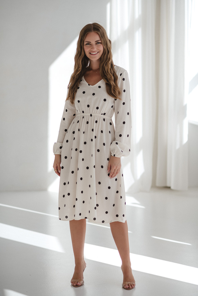 Rochie midi adorabilă Milk&Love crem cu buline – rochie de maternitate și alăptare din in, croială elegantă cu fermoare pentru alăptare