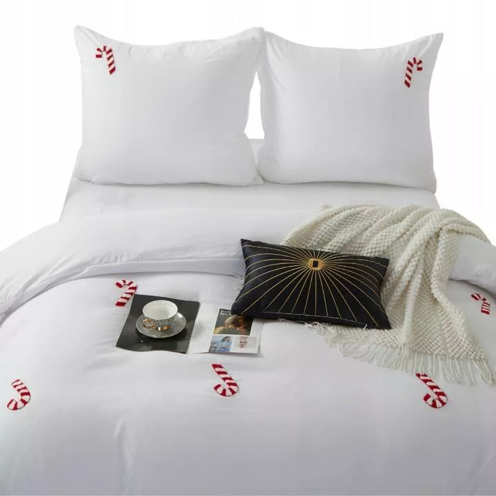 Set de lenjerie de pat din microfibră Cuty Candycanes de Crăciun de la Spod Igły i Nitki – Alb cu aplicații 3D cu acadele, închidere cu fermoar