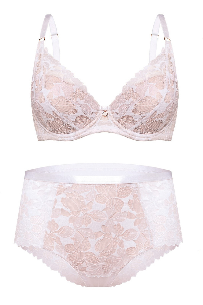 Chiloții sunt realizați din dantelă florală fină, căptușită cu plasă elastică bej, ceea ce îi face plăcuți la contactul cu pielea și mai discreți sub hainele deschise la culoare. Talie înaltă și croiul complet, alături de lateralele late și bine acoperite, oferă siguranță la purtare și împiedică rularea materialului. Partea frontală este decorată cu o bandă elastică plată, care se adaptează taliei fără să strângă și fără să se observe sub îmbrăcăminte, iar spatele finisat cu dantelă adaugă o notă feminină și rafinată.