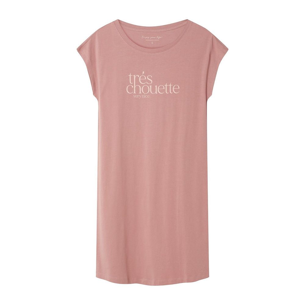 Rochia are un decolteu rotund, maneca scurtă și un croi lejer, care asigură confortul necesar pentru o noapte liniștită. Pe partea din față se află un detaliu delicat sub forma unui mic text, care adaugă un plus de stil și unicitate. Croiul liber permite o libertate de mișcare maximă, iar lungimea până la genunchi o face potrivită pentru orice sezon.