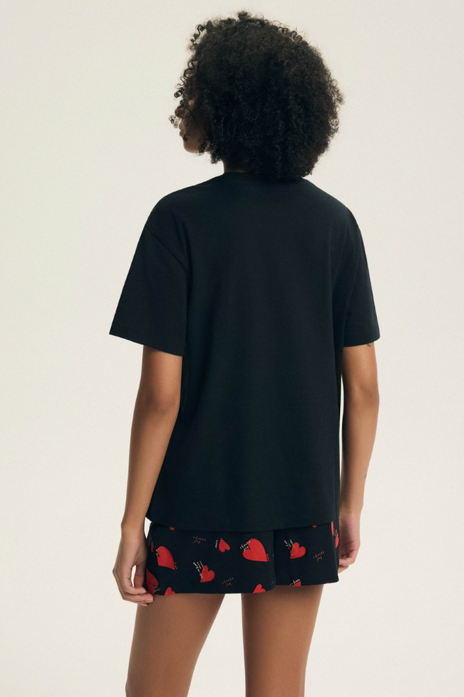 - Bumbac natural, croială lejeră și imprimeu feminin cu inimioare. Pijamă comodă pentru somn și relaxare acasă.