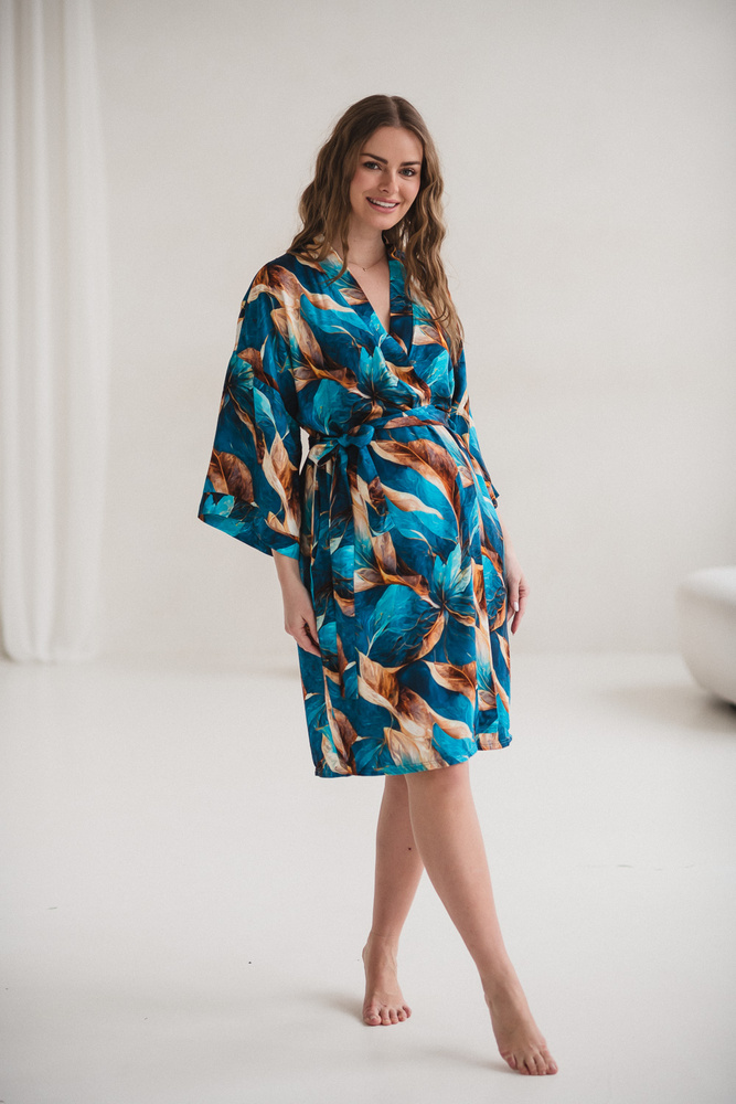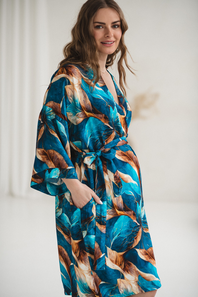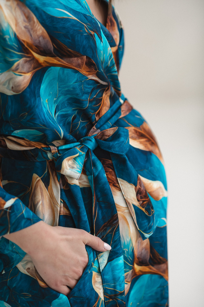 Croiala tip kimono, cu cordon reglabil, permite ajustarea lățimii, astfel încât halatul să se potrivească burticii în creștere și să rămână confortabil și după naștere. Lungimea potrivită oferă discreție în spital sau acasă, inclusiv în timpul alăptării. Mânecile 7/8 nu incomodează în îngrijirea nou-născutului, iar buzunarele sunt utile pentru obiectele mici de zi cu zi.