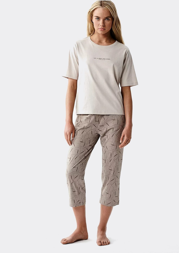 Bluza cu mânecă scurtă are un decolteu rotund clasic, care nu strânge și se așază natural pe corp. Inscripția delicată din partea frontală adaugă un accent modern, discret. Pantalonii 3/4, cu model, sunt prevăzuți cu buzunare laterale la nivelul șoldurilor – un detaliu practic pentru telefon sau obiecte mici, transformând această pijama din bumbac într-un set versatil pentru casă.