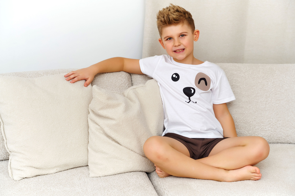 Confecționată din tricot de bumbac de înaltă calitate, pijamaua este plăcută la atingere și permite pielii să respire. Bumbacul natural ajută la menținerea unei temperaturi corporale echilibrate pe timpul nopții și reduce riscul de supraîncălzire. Tricoul cu mânecă scurtă are o croială lejeră, care nu limitează mișcarea în timpul somnului sau al activităților de seară. Șortul cu talie elastică se adaptează ușor siluetei copilului, oferind confort fără să strângă.