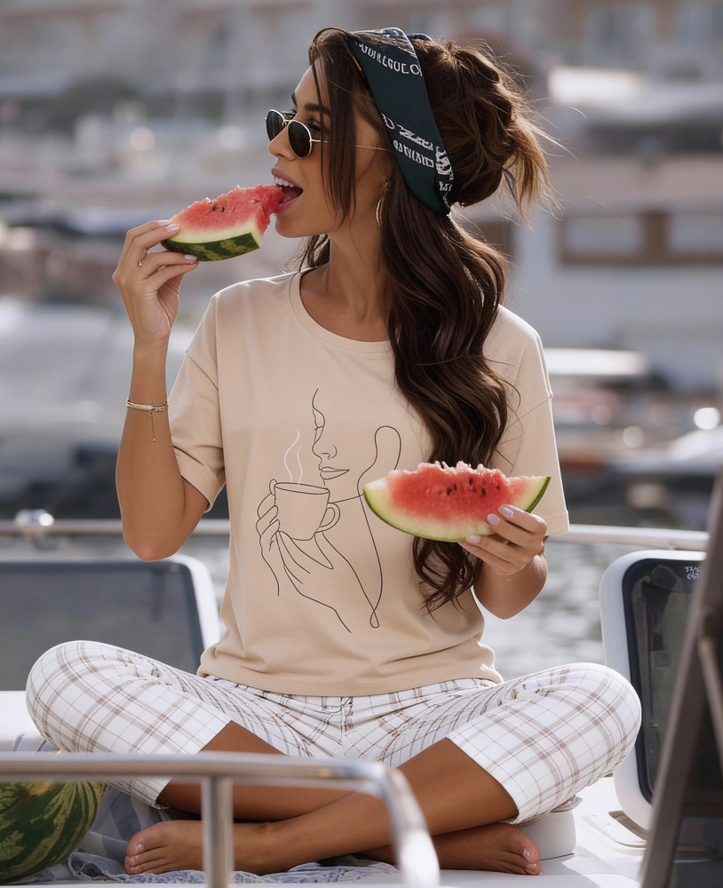 Pijama este realizată integral din bumbac de înaltă calitate. Fibra naturală este moale, respirabilă și permite pielii să respire, contribuind la menținerea unei temperaturi confortabile în timpul nopții. Bluza cu mânecă scurtă are un decolteu rotund clasic, care nu strânge și oferă libertate de mișcare. Imprimeul discret din partea frontală adaugă un detaliu feminin, fără a încărca designul.