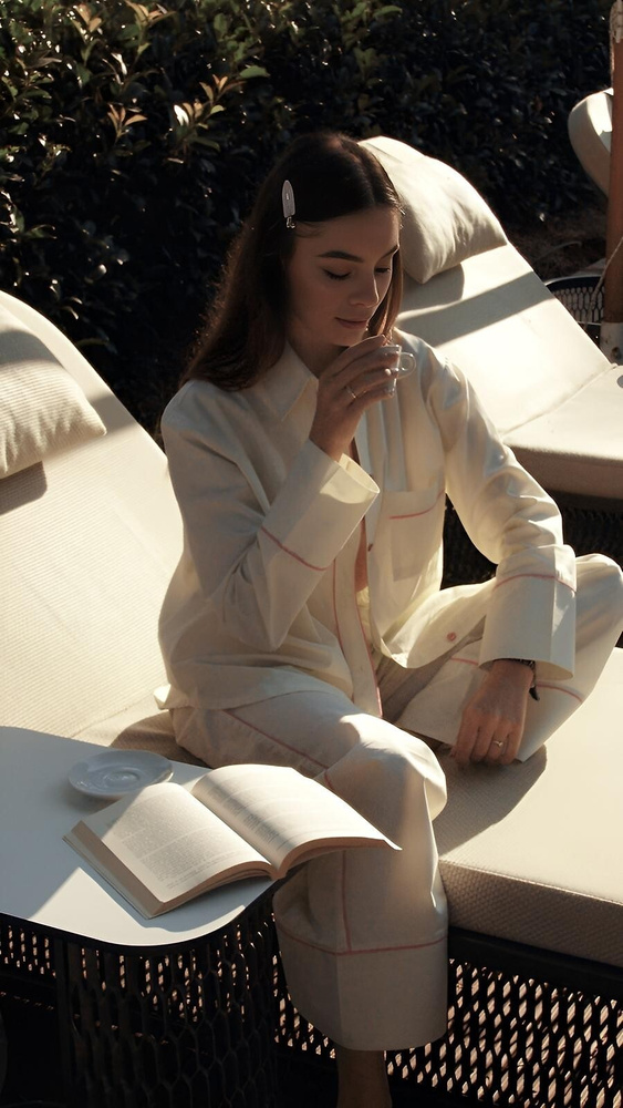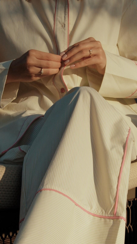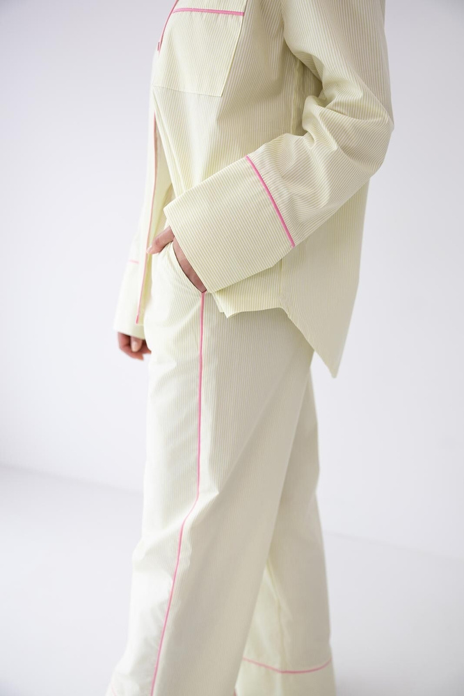 Partea superioară este o cămașă cu mânecă lungă și imprimeu în dungi, cu guler clasic și închidere frontală cu nasturi. Acest design conferă pijamalei un aspect elegant și îngrijit, dar în același timp relaxat. Datorită croielii tip cămașă, modelul poate fi purtat nu doar pentru dormit, ci și ca ținută confortabilă pentru dimineți liniștite sau seri petrecute acasă.