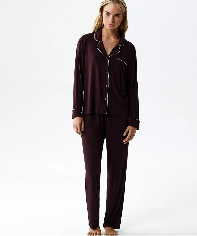 Partea superioară este o bluză cu mânecă lungă, guler clasic și închidere cu nasturi, care oferă un aspect elegant și atemporal. Pe piept este aplicat un mic buzunar decorativ, care completează designul într-un mod discret și rafinat. Astfel, pijamaua este potrivită nu doar pentru somn, ci și pentru dimineți liniștite sau seri relaxante acasă.