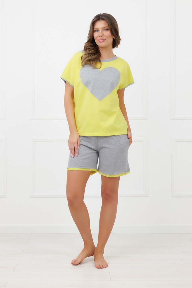 Partea superioară este o bluză cu croială confortabilă și decolteu tip bărcuță, care poate fi purtat ușor lăsat pe un umăr. Acest detaliu oferă modelului un aer feminin și ușor cochet. În partea frontală se află o aplicație în formă de inimă într-o culoare contrastantă, care atrage privirea și oferă pijamalei un caracter romantic. Mânecile sunt finisate cu o bordură decorativă în culoarea inimii, creând un design armonios.