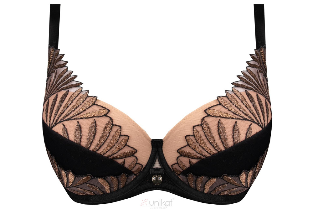 Partea superioară a cupelor este realizată din tulle transparent cu broderie elegantă, care creează un motiv delicat asemănător unor pene sau frunze deschise. Acest detaliu adaugă feminitate și rafinament modelului, menținând în același timp structura stabilă a sutienului. Partea inferioară a cupelor este realizată dintr-un material mai ferm, pentru a oferi un suport suplimentar.