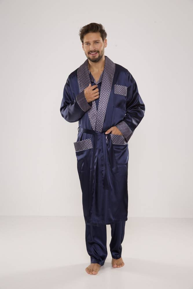 Pijama elegantă pentru bărbați, lungă, descheiată, cu guler și buzunare.