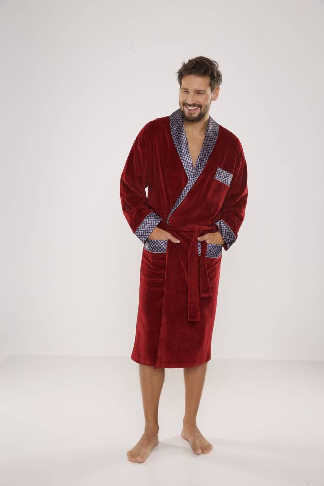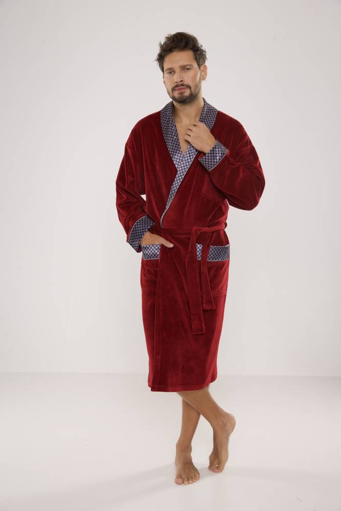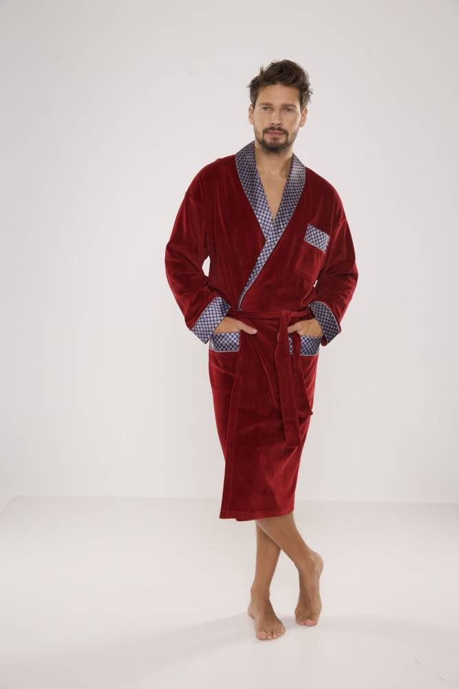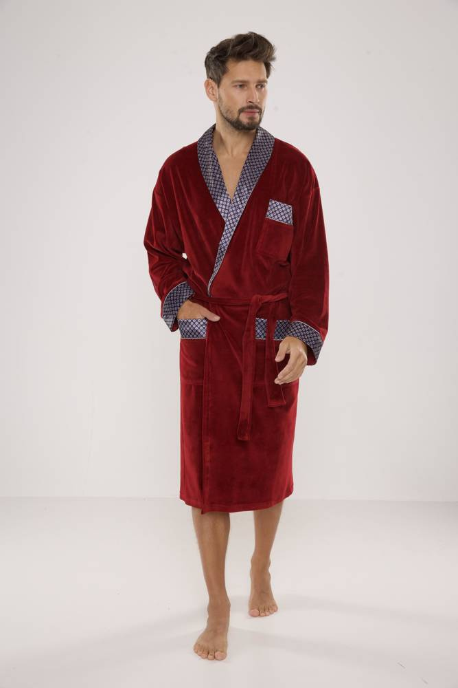 .Halat bărbătesc lung din catifea, cu guler tip șal, cu curea, cu două buzunare aplicate și un buzunar mai mic la nivelul pieptului. Manșete, guler și buzunare finisate în satin cu model. Este fabricat din 80% bumbac plăcut la atingere, cu absorbție perfectă a apei.