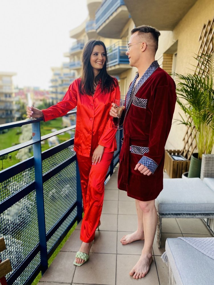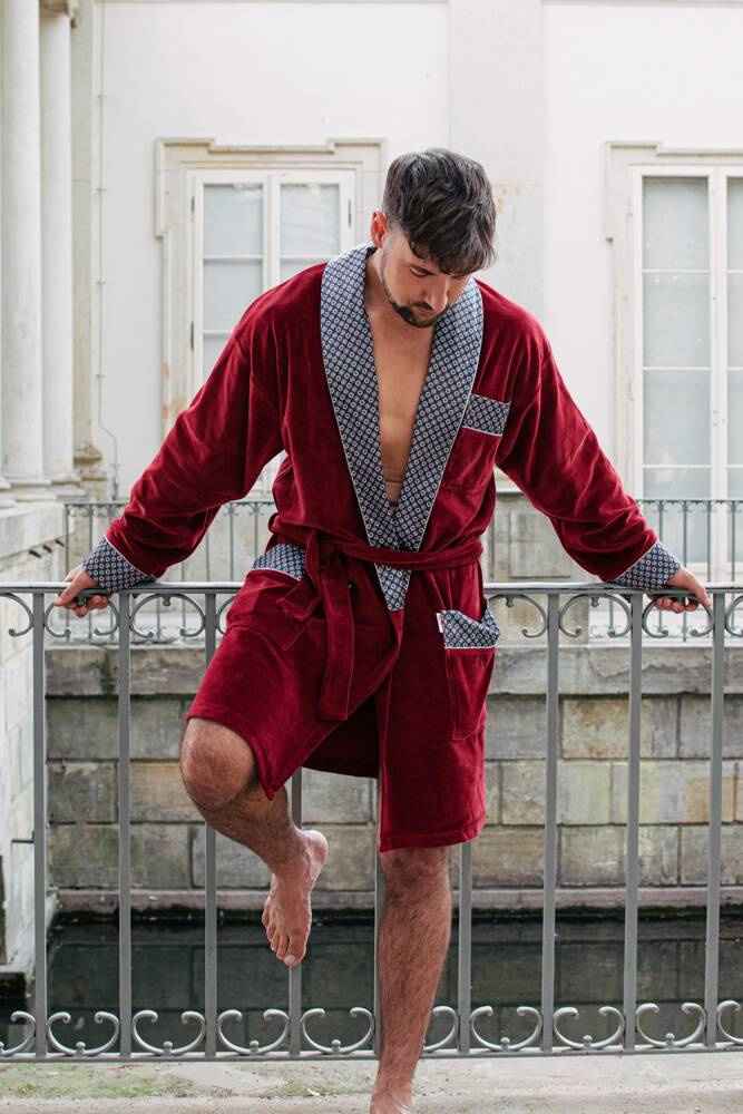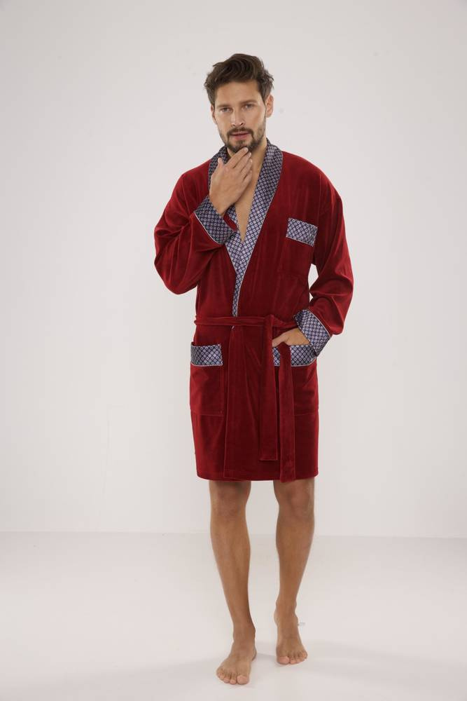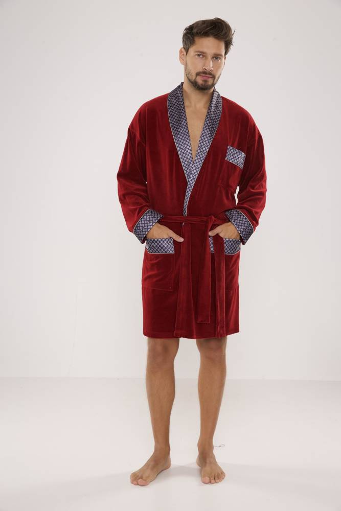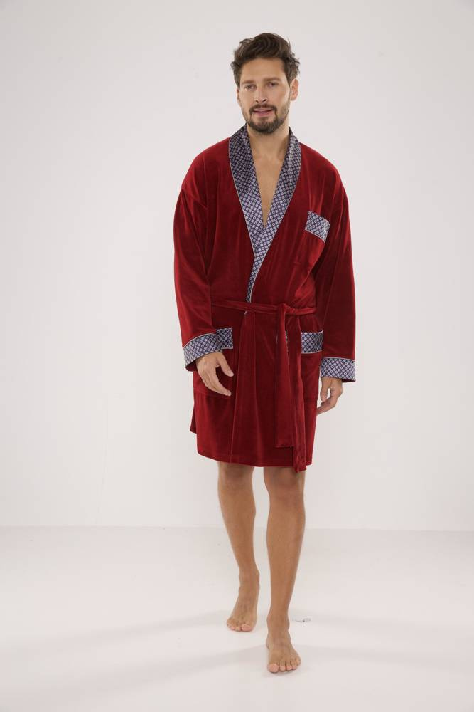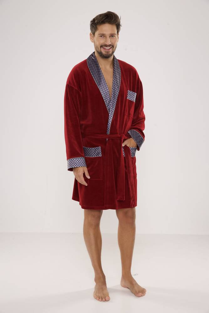 Halat bărbătesc scurt din catifea, cu guler șal, legat în talie, cu două buzunare aplicate și un buzunar mai mic la nivelul pieptului. Manșete, guler și buzunare finisate în satin cu model. Este fabricat din 80% bumbac plăcut la atingere, cu absorbție perfectă a apei.