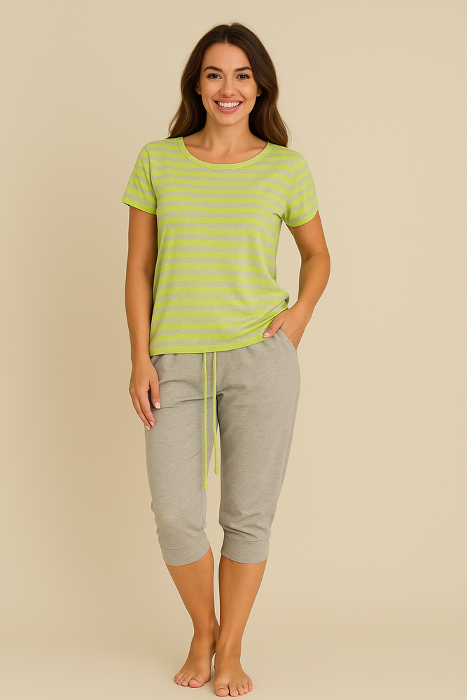 Pijama de damă din viscoză de înaltă calitate. Tricou în dungi cu mâneci scurte, spate ușor extins. Pantaloni solizi cu buzunare 3/4 lungime. Picioare cu capete canelate.