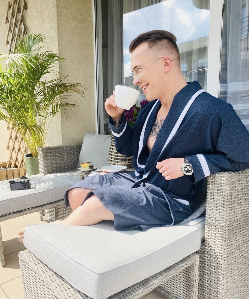 Avem în ofertă un halat de baie lung exclusiv cu guler, legat la talie.