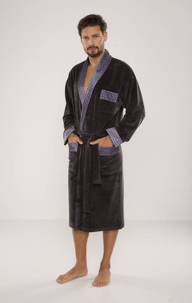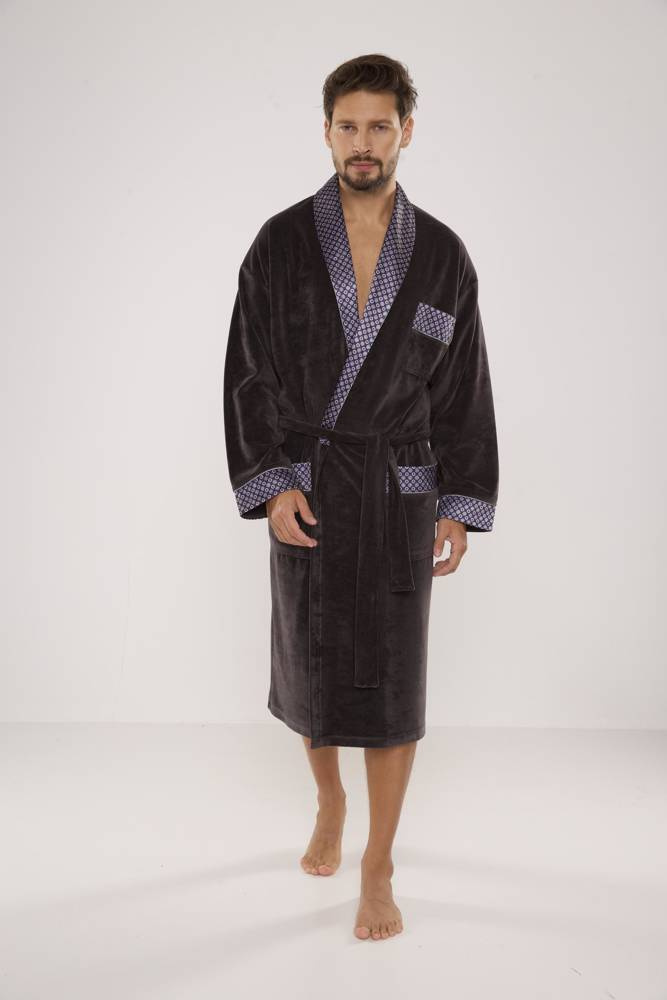 .Halat bărbătesc lung din catifea, cu guler tip șal, cu curea, cu două buzunare aplicate și un buzunar mai mic la nivelul pieptului. Manșete, guler și buzunare finisate în satin cu model. Este fabricat din 80% bumbac plăcut la atingere, cu absorbție perfectă a apei.