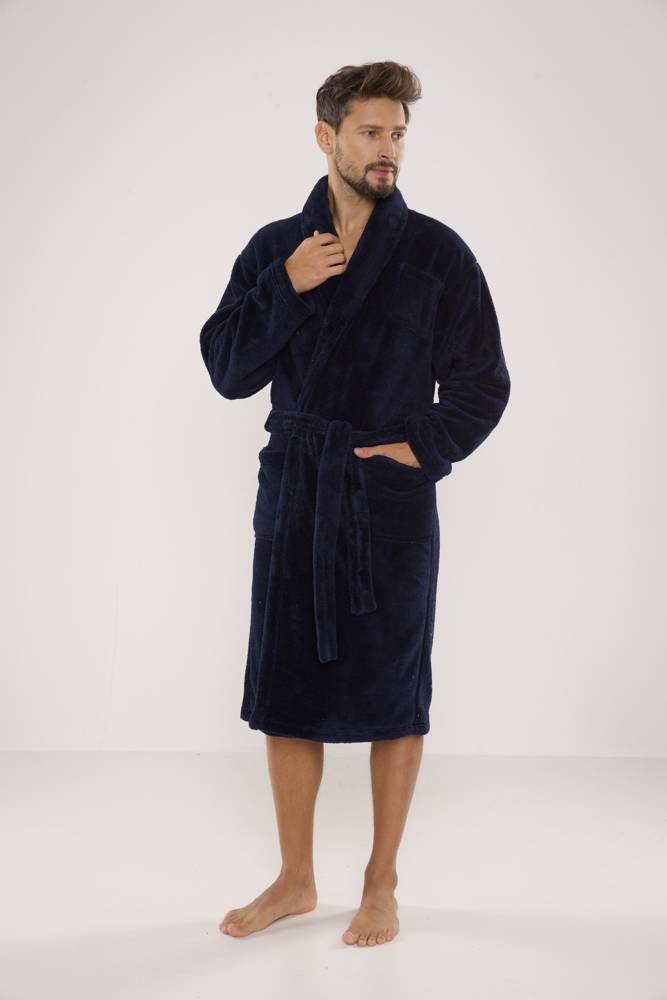 Halat de baie elegant, foarte confortabil, pentru bărbați. Fabricat din țesătură tricotată de pluș caldă, moale și plăcută la atingere. Tăietura clasică arată bine pe siluetă. Modelul are două buzunare practice și o cravată la talie.