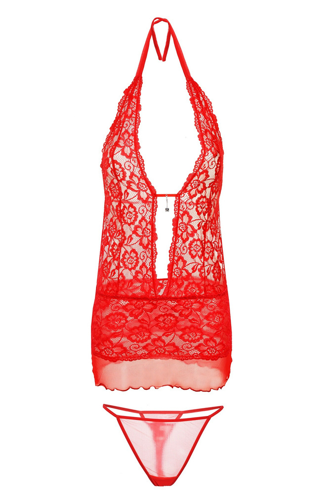 Seksowny komplet dwu częściowy w którego w skład wchodzą koszulka oraz stringi. Koszula wykonana jest z delikatnej elastycznej, przyjemnej koronki z pogłębionym dekoltem, zdobionym biżuteryjną symilką. Tył odcięty od pasa, wiązana na szyi oraz dodatkowo na plecach. Dół wykończony delikatnym tiulem. Dostępna wersja kolorystyczna: czerwony, czarny, ecru.