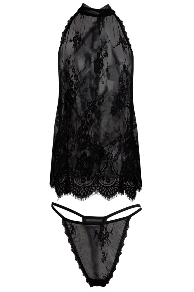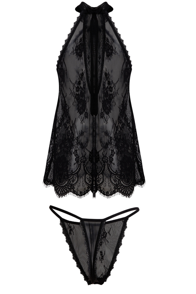 Niezwykle seksowny i romantyczny komplecik wiązany na szyi. Koronkowy materiał nadaje seksapilu. Dodatkiem do kompletu są stringi. Wykonany z najwyższej jakości materiału.
