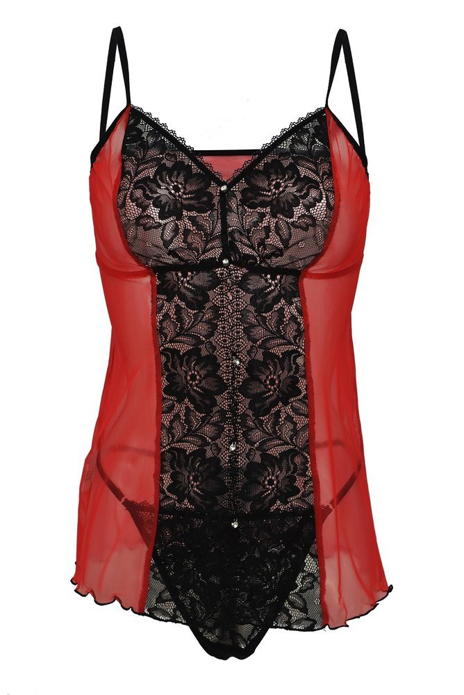 Miseczki halki profilowane, na środku rozcięcie z ozdobną biżuterią, Ramiączka cienkie i regulowane, dzięki czemu długość koszulki można dopasować wedle własnego komfortu. Komplet wykonany z najwyższej jakości tkaniny.