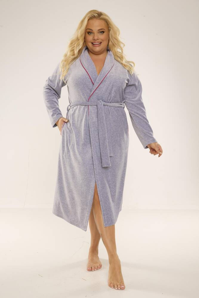 Halat de baie lung, confortabil pentru femei, cu guler șal. Fabricat din catifea plăcută care se simte bine pe corp. Legat la talie, cu buzunare. Împodobită cu bordură de culoare contrastantă.