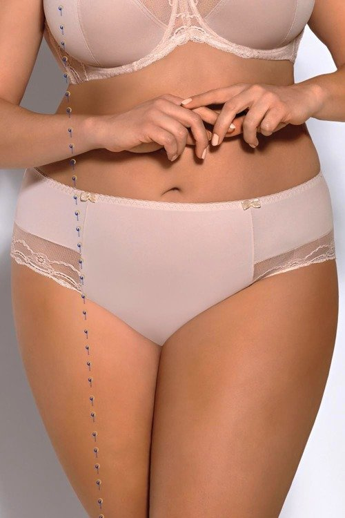 Slipi clasici, plini, realizați din microfibră netedă combinată cu dantelă delicată. Picioarele din față sunt decorate cu dantelă atrăgătoare. Inserție de dantelă triunghiulară pe spate, iar picioarele sunt finisate cu un elastocord decorativ. Partea din față este decorată cu arcuri subtile.