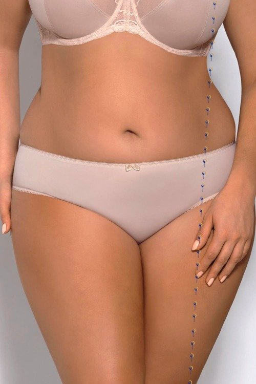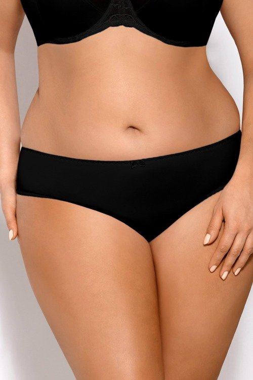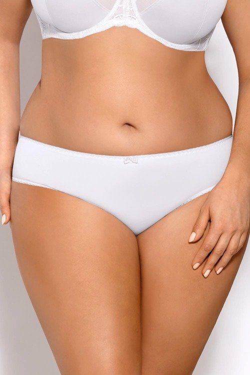 Chiloți clasici, netezi, din microfibră combinată cu dantelă delicată. Picioarele din față sunt finisate cu o căptușeală subtilă din cauciuc. Spatele este finisat cu o garnitură de dantelă. Partea din față este decorată cu o fundă mică.