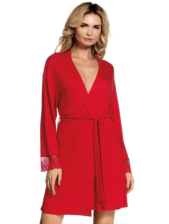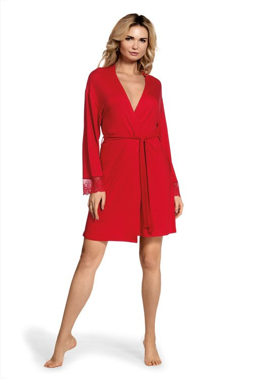 Halat de damă din viscoză de înaltă calitate 94% cu adaos de elastan. Scurt, legat la talie, cu mâneci lungi. Manșete finisate cu dantelă ajurată.