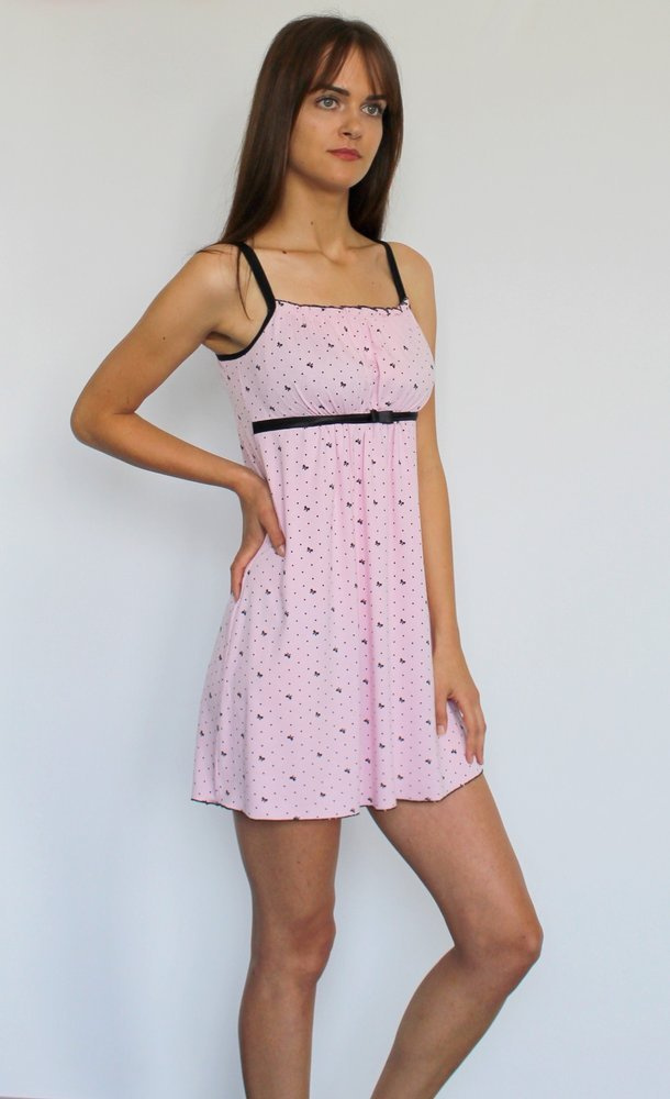 Cămașă de damă decorată cu un model de fundă, din viscoză de înaltă calitate. Curele înguste, reglabile. Se taie sub bust cu o panglică de satin.